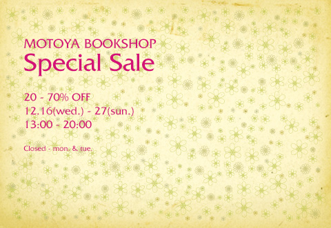 09/12/09 / 最終更新日時 : 18/11/16 nonewsfrommotoya Event MOTOYA BOOKSHOP Special Sale MOTOYA BOOKSHOP、年に1度のSpecial Saleを行います! 20~70%OFF 2009/12/16(水)~27(日) 13:00~20:00 ※セール中は、12/21,22のみお休み致します。 アート・写真集・デザイン・建築・インテリア・ファッションなど、洋書を中心に、取り扱っています。 普段、店頭に出していない本の販売も致します。 ※一部、セール除外品も有ります。 FacebookXBlueskyHatenaCopy